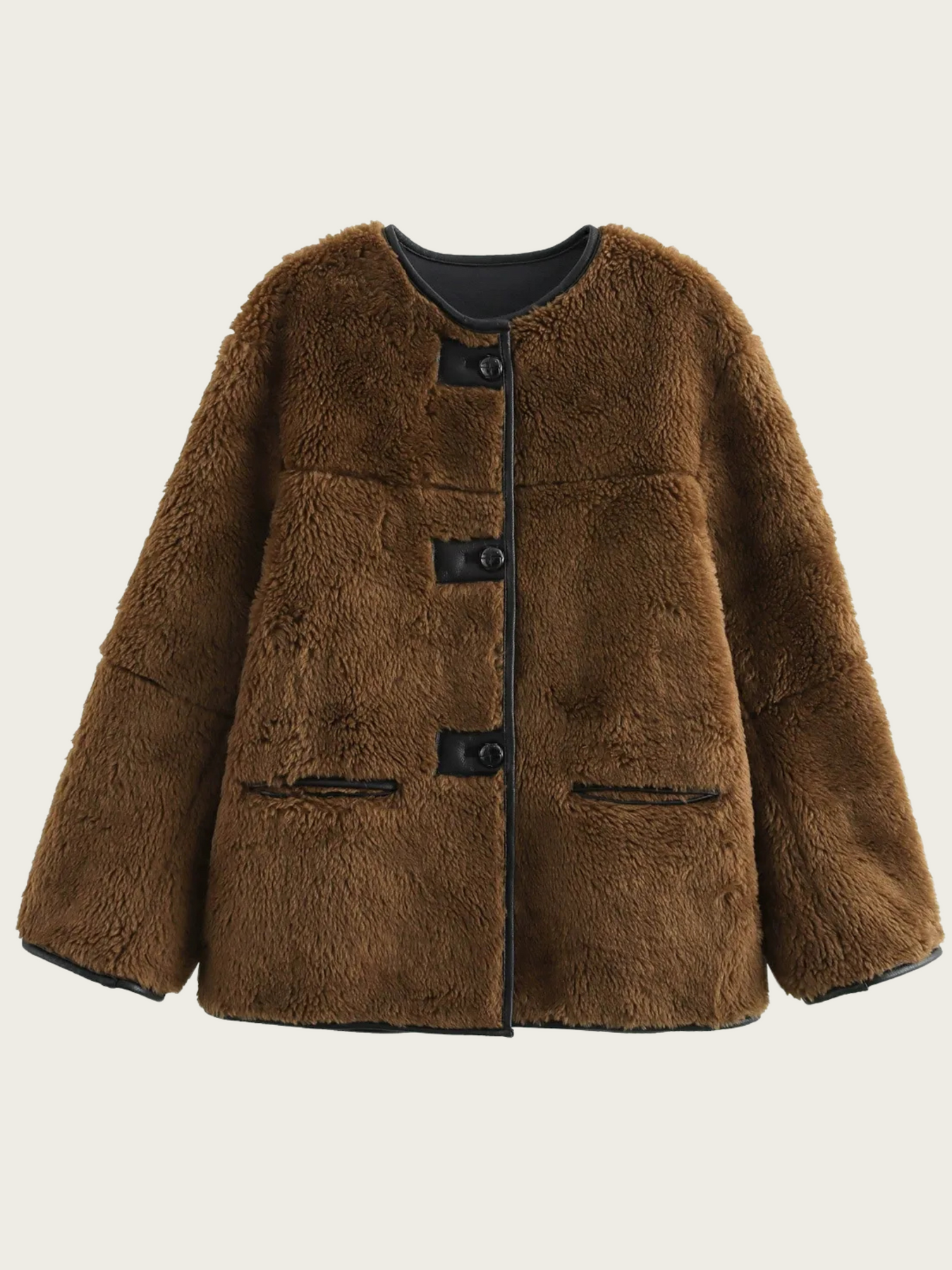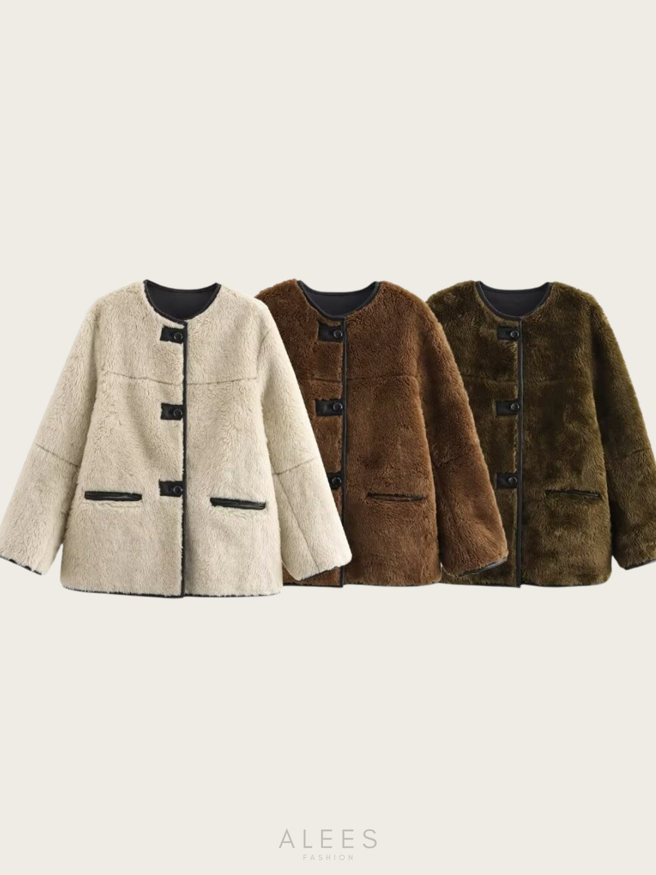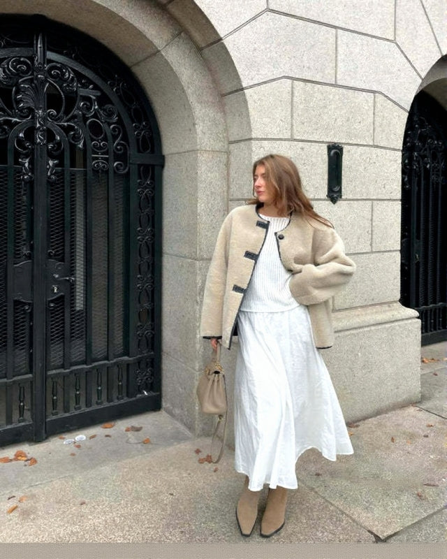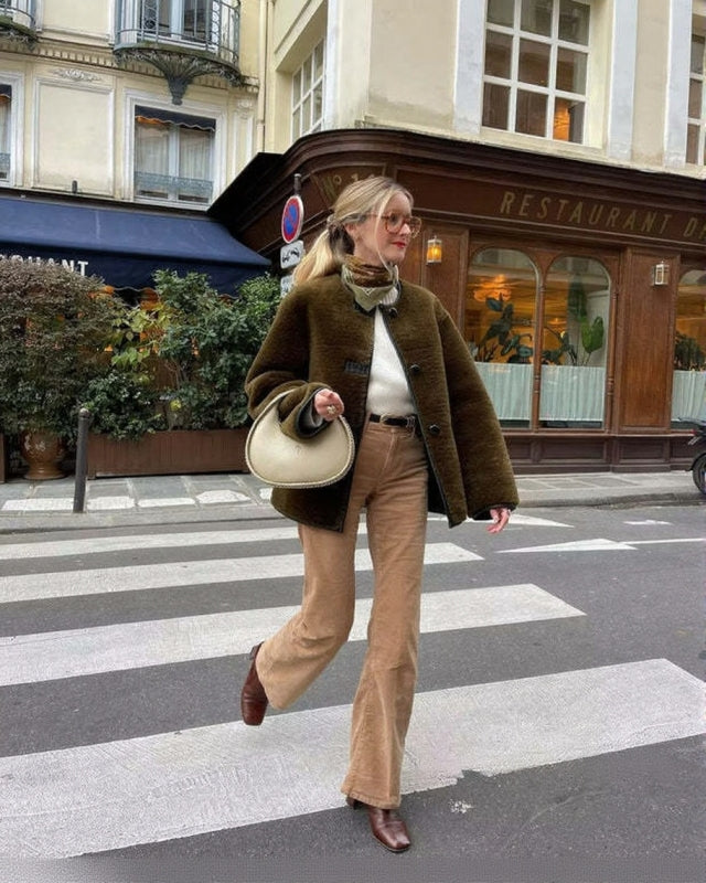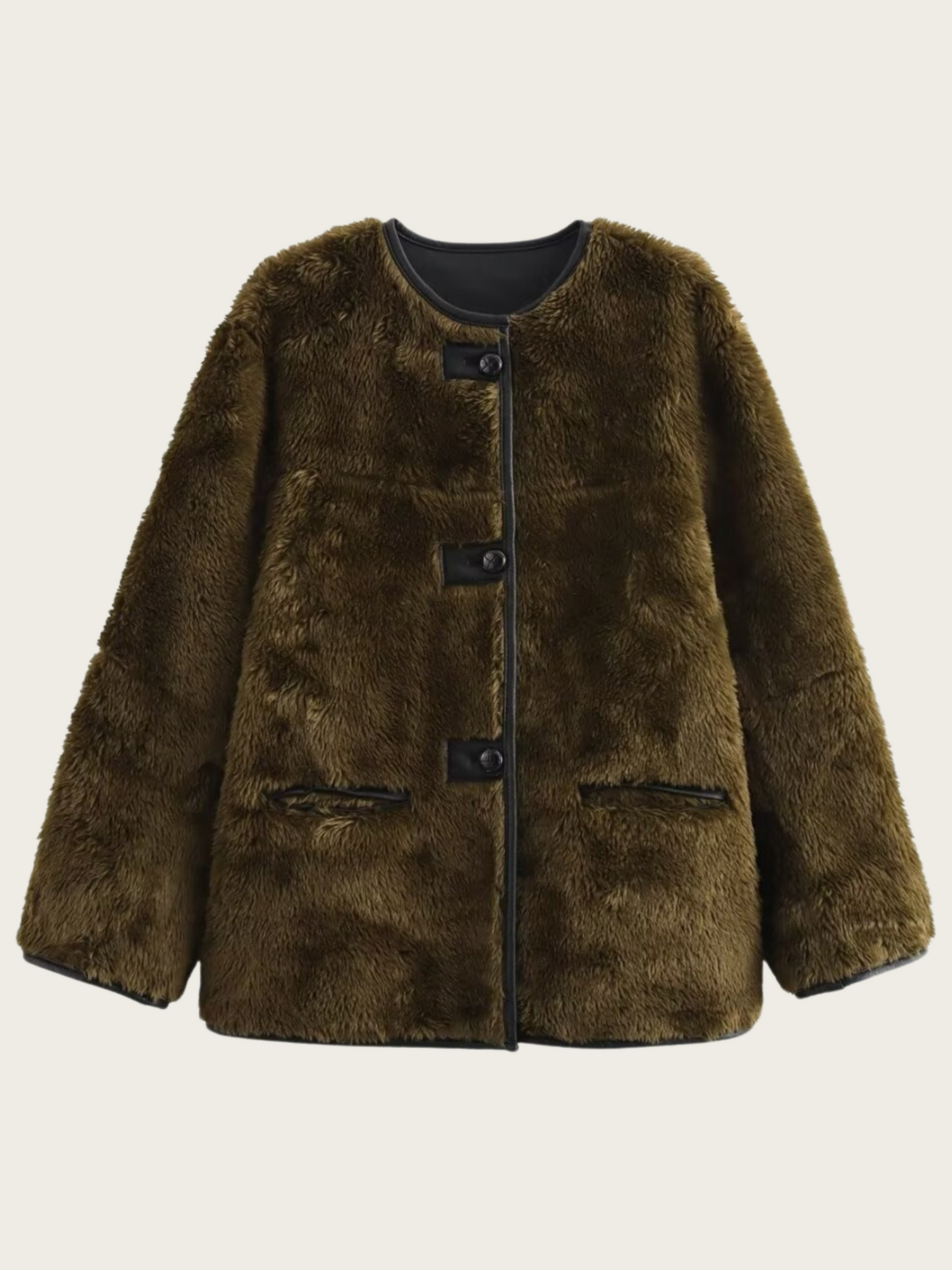 Omfavn den luksuriøse varme med Kaida | Frakke i Imiteret Pels, et chic og markant stykke til den moderne garderobe. Denne hyggelige frakke har en klassisk rund halsudskæring og en front med flere knapper, der giver tidløs elegance. Den fløjlsagtige tekstur, der fås i sofistikerede nuancer som off-white, Coffee og olivengrøn, giver komfort og sofistikeret stil, som det ses i den bløde og indbydende pasform.