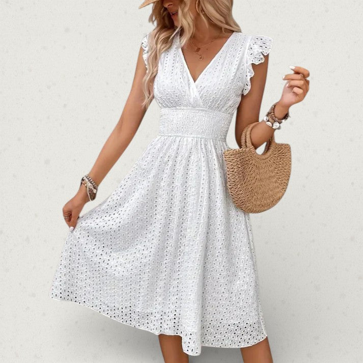 Træd ind i en verden af tidløs skønhed med Eva flutterærme-kjolen. Skabt til at fremhæve din naturlige skønhed, kombinerer denne kjole yndefuld bevægelse med flatterende stil. Uanset om du deltager i et formelt arrangement eller nyder en afslappet dag, vil Eva sikre, at du føler dig stilfuld og selvsikker.
