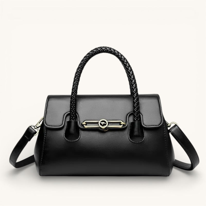 Oplev tidløs elegance med RONJA™ – en klassisk håndtaske i luksuslæderlook, prydet med et smukt flettet håndtag og eksklusive gulddetaljer. Perfekt til både arbejde og fritid, denne taske tilføjer øjeblikkeligt raffineret stil til ethvert outfit.