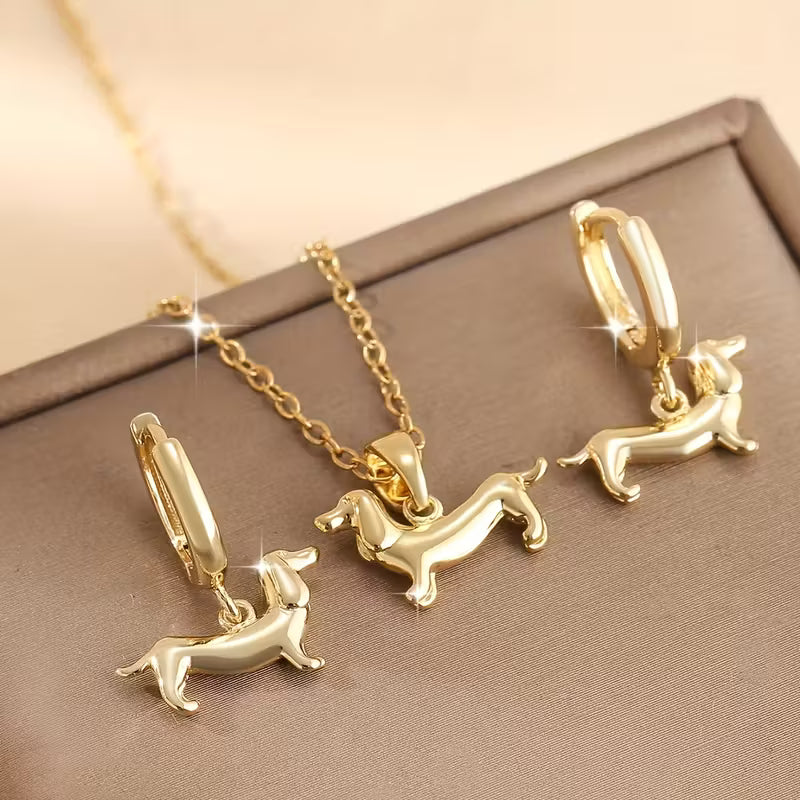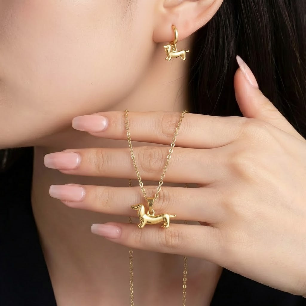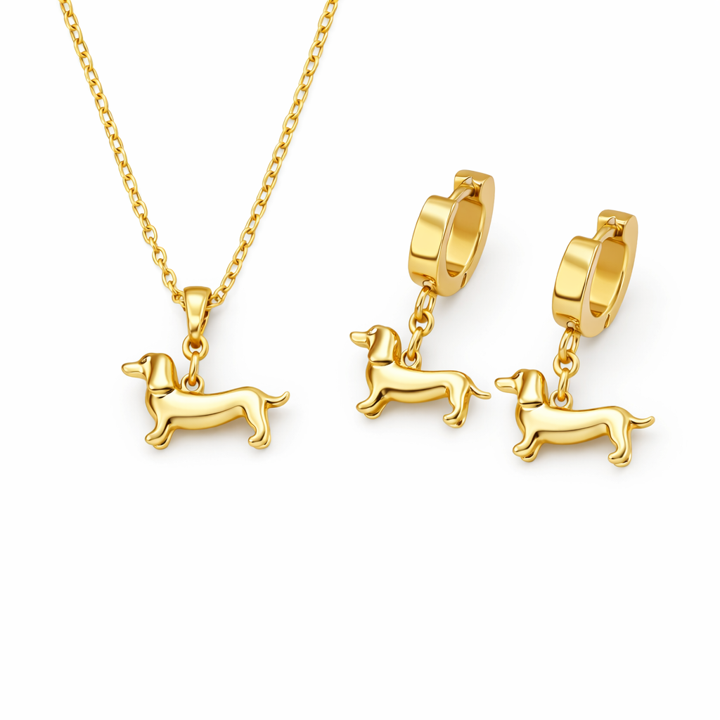 Indeholder en halskæde og matchende øreringe med gravhundemotiv.